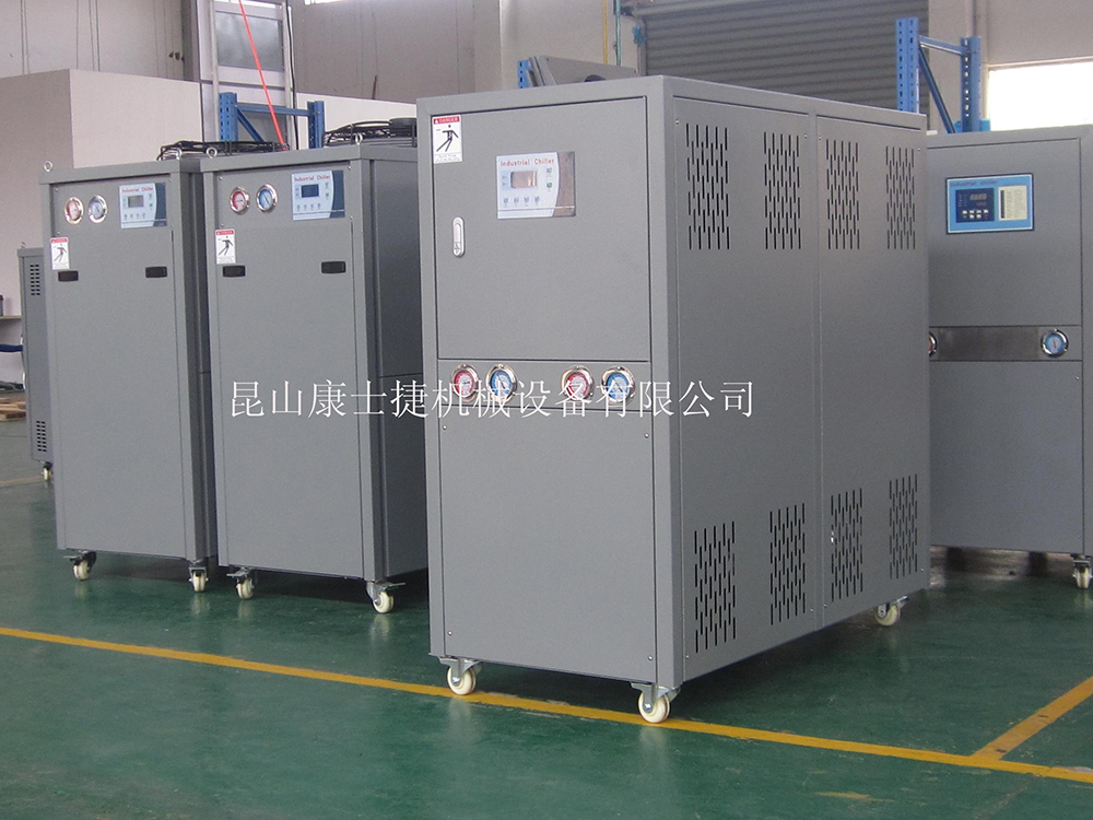電鍍槽控溫用制冷機(jī)組用于電鍍液冷卻,使金屬、非金屬分子穩(wěn)定.冷水機(jī)使金屬分子隨著穩(wěn)定的電流快速貼附上鍍件表面,增加鍍件的密度和平滑,縮短電鍍周期,提高質(zhì)量,并可有效地回收各類昂貴的化學(xué)物質(zhì),工業(yè)制冷設(shè)備同理也適用于真空鍍膜工業(yè) 。A.直接冷卻:即鍍液直接通過過濾機(jī)或是過濾網(wǎng)進(jìn)入冷凍機(jī)的蒸發(fā)器進(jìn)行降溫再回到氧化槽。此冷卻方式的優(yōu)缺點(diǎn):冷卻時間短、效果好;缺點(diǎn)就是蒸發(fā)器需要做防腐處理(一般采用鈦合金),蒸發(fā)器里容易結(jié)垢,需定期清洗,否則影響制冷效果和機(jī)器運(yùn)行。B.間接冷卻:氧化槽里鋪置鈦管,冷凍水通過鈦管帶走渡液熱量達(dá)到降溫目的;若鋪鈦管不便可添一換熱器(需是鈦合金制成)一邊走冷凍水一邊走鍍液。